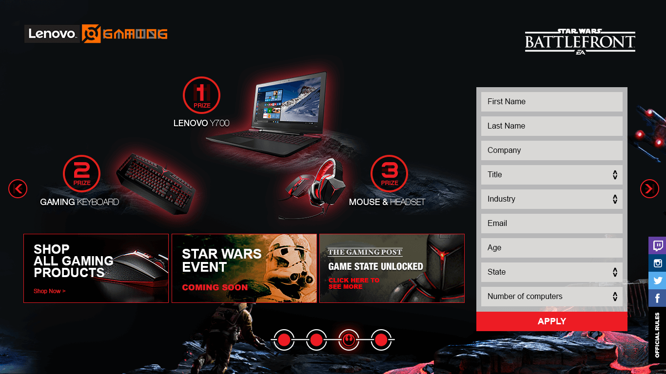 This landing page was made to promote the products of Lenovo designed for gamers. For this action the new game Starwars Battlefront was used.